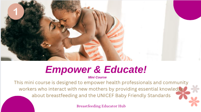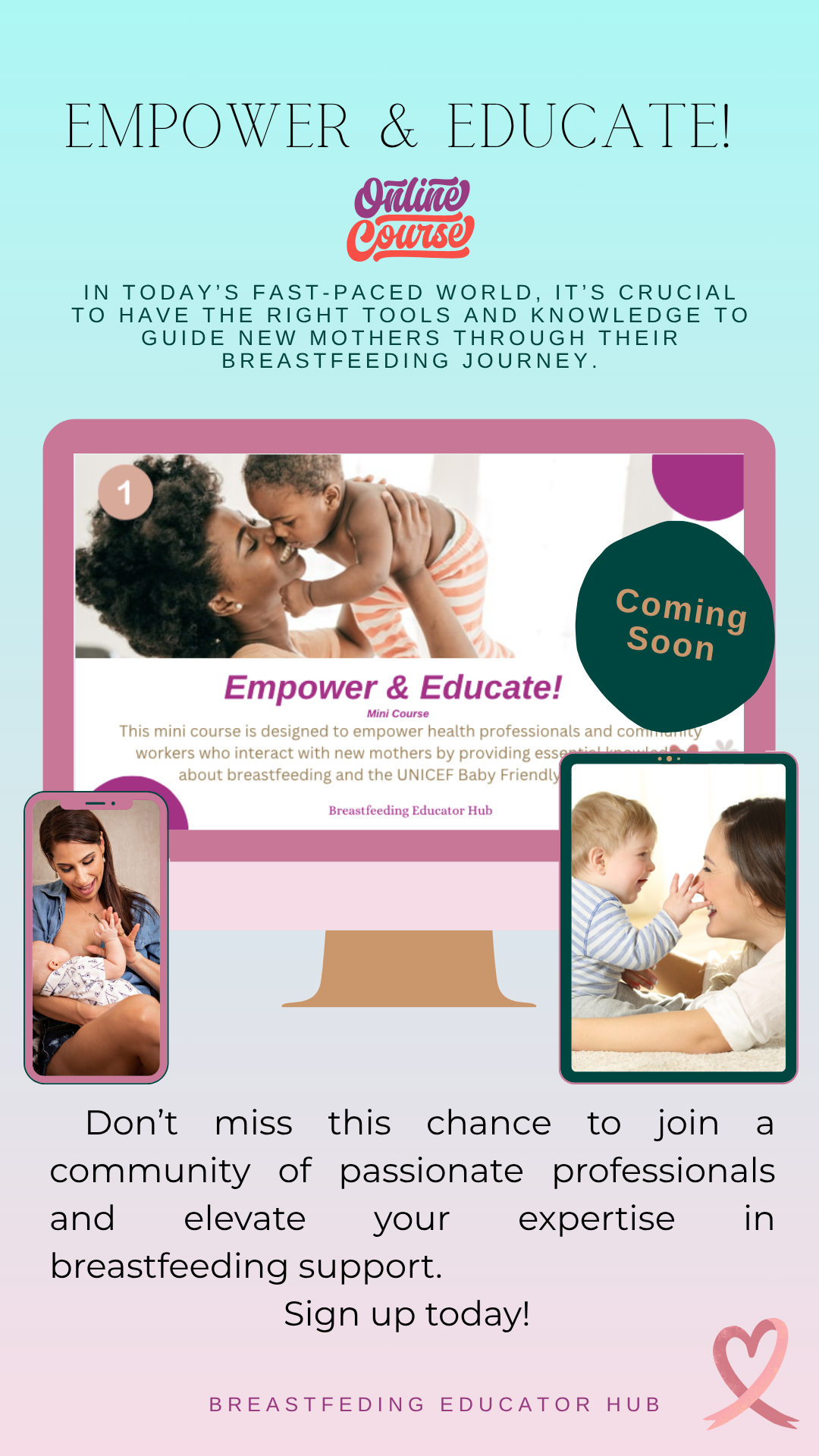 Introducing "Empower and Educate," a dedicated mini course designed for health professionals and community workers who interact with new mothers and babies. This course aims to equip you with essential knowledge about breastfeeding and the UNICEF Baby Friendly standards, empowering you to provide the best support for mothers and their infants while ensuring a breastfeeding-friendly environment.